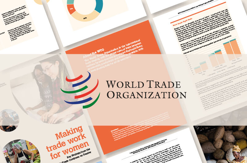 The World Trade Organization asked us to design an annual report titled Making Trade Work for Women, based on their key findings from the first-ever international research conference on trade and gender, the 2022 World Trade Congress on Gender.